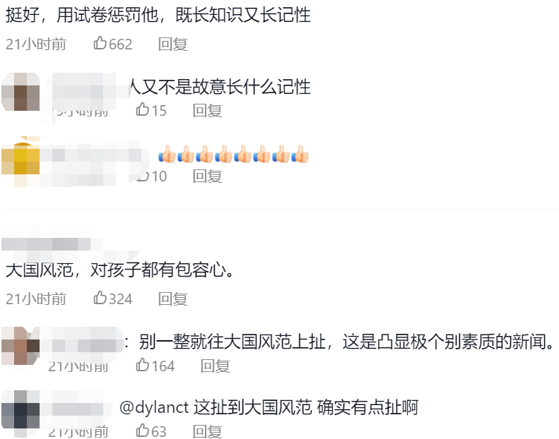 还有很多网友夸赞学生敢于承担错误的行为,其实孩子的素质教育问题很重要,有些家长过于溺爱孩子,反而会影响学生们的成长,该惩罚的时候还是要惩罚,这样才能让孩子更清楚对错。