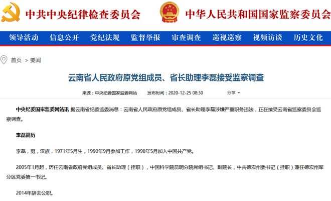 12月25日,据云南省纪委监委消息:云南省人民政府原党组成员、省长助理李磊涉嫌严重职务违法,正在接受云南省监察委员会监察调查。